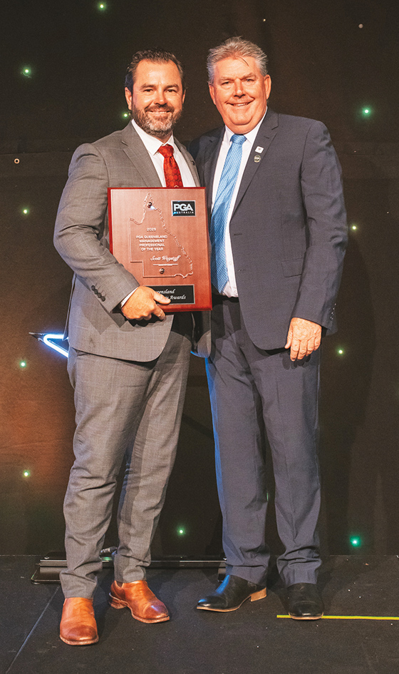 Scott Wagstaff accepting an award for Queensland PGA Management Professional of the Year from fellow Queensland PGA member Steve Hutchison.
